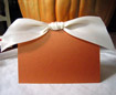 Autumn Harvest is a dramatic, shimmering pearl pocket-fold invitation.  Inner layers are shimmering copper and pearl.  Coppery grosgrain ribbon wraps around the front of the invitation adorned with front double layer tag.  Pocket size is approximately 5.5" x 5.5"